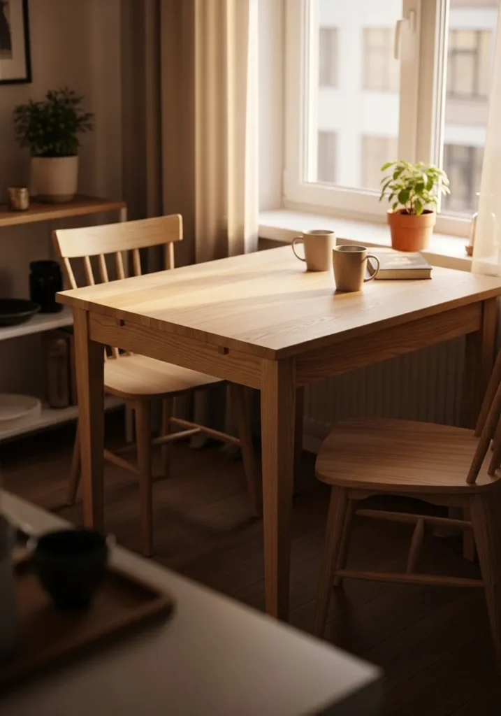 A solid wooden dining table sits comfortably in a small dining area, paired with simple chairs that do not visually crowd the space. The proportions are just right, offering enough room for meals while keeping the footprint modest. Natural light highlights the wood grain beautifully.