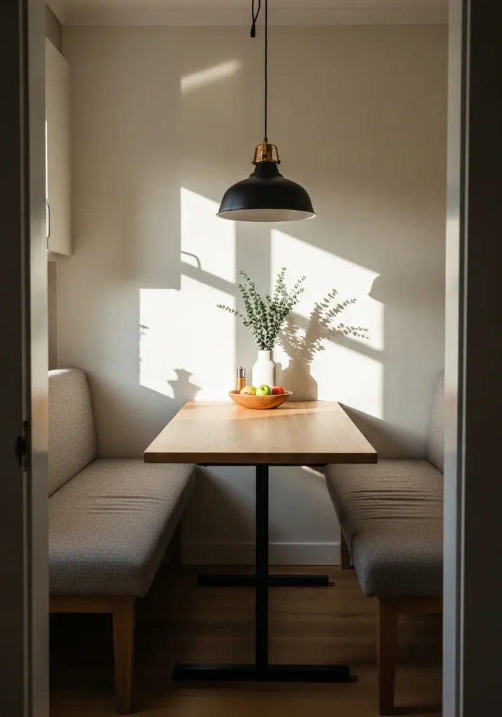 A compact dining nook with built in bench seating makes the most of every inch. The table is slim and centered, while the benches slide right underneath when not in use. Soft light and simple styling keep the area from feeling boxed in.