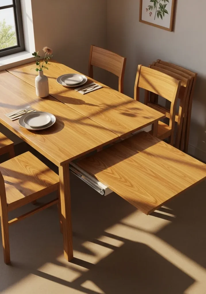 This design features a compact wooden dining table with a simple pull out extension that instantly adds extra surface space. When closed, it stays neat and narrow. When opened, it comfortably fits more place settings without overwhelming the room. The warm wood tones keep it feeling inviting and grounded.