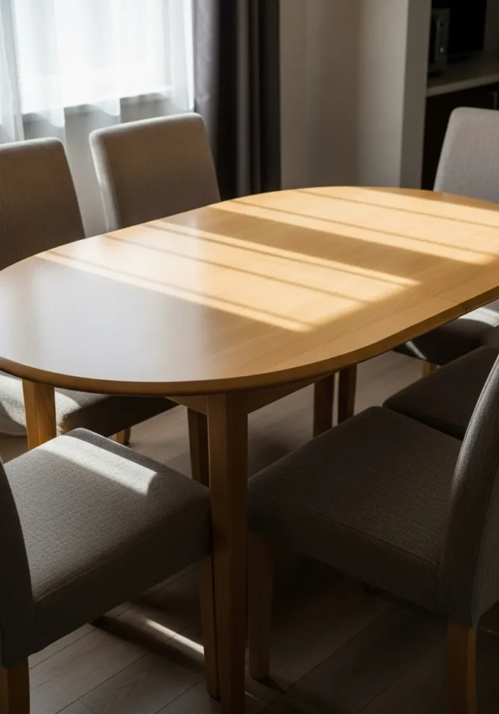 This dining table has gently rounded edges, making it ideal for tight layouts where sharp corners would feel awkward. The shape allows chairs to tuck in easily and keeps walkways open. Upholstered seating adds comfort without bulk.