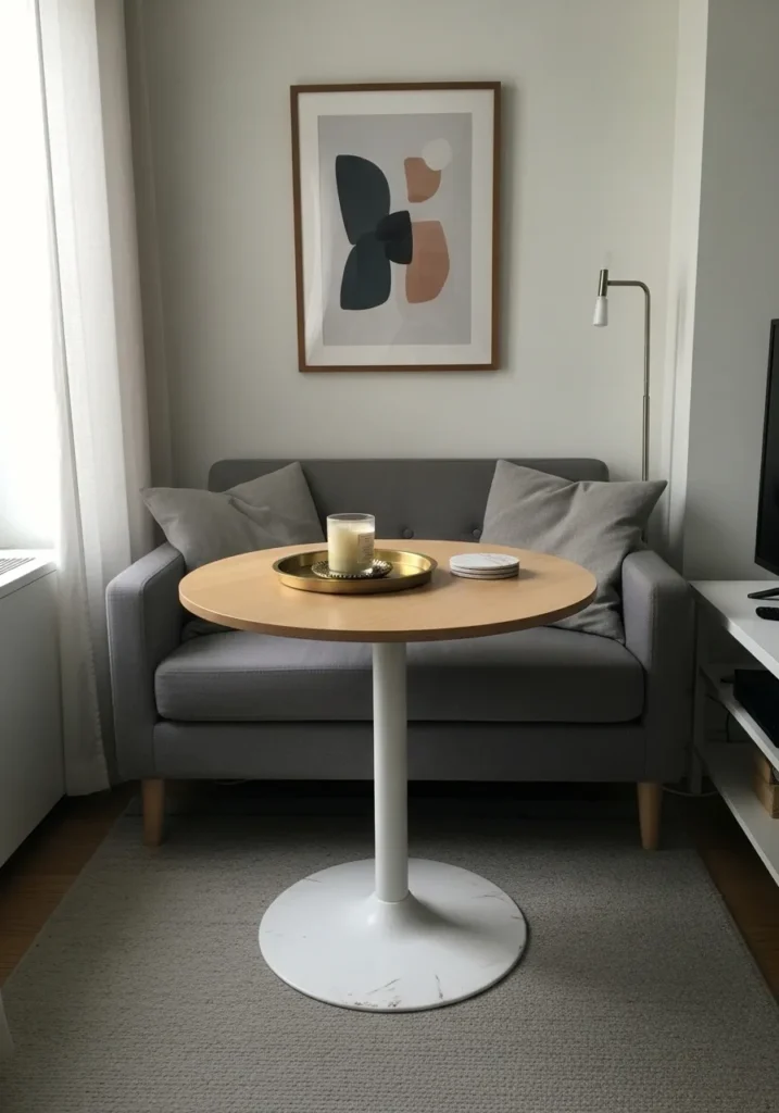 This lovely setup showcases a slender pedestal table that fits perfectly in front of a compact gray loveseat. The light wood top adds a touch of warmth to the neutral room, while the white marble base keeps things feeling airy and sophisticated. It is styled simply with a golden tray and a single candle, which creates a focused and uncluttered look. The round shape is a total lifesaver for small floor plans because it eliminates sharp corners and makes moving around the furniture so much easier.