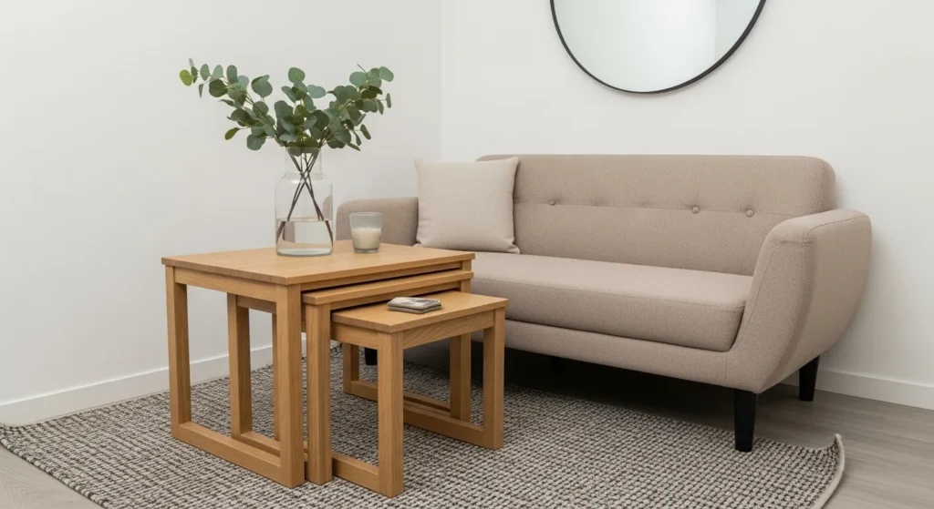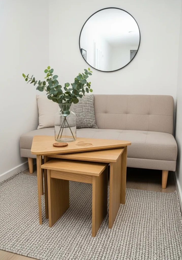 These clever wooden nesting tables offer a geometric twist that saves a ton of floor space. The warm oak finish coordinates beautifully with the neutral tones of the small sofa and textured rug. Because of their unique triangular shape, they can be tucked away neatly or spread out when guests come over for snacks and drinks. A simple glass vase with greenery on top adds a natural element that makes the whole corner feel fresh and alive.