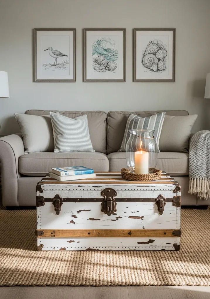 This charming setup features a vintage-style trunk that doubles as a sturdy coffee table with tons of personality. The white distressed finish and wooden slats give it a weathered, beachy look that pairs perfectly with the neutral beige sofa and natural jute rug. Metal latch details add an antique touch, while the flat top provides just enough room for a glass hurricane candle and a few favorite books. Using a chest like this is such a smart move for small spaces because it provides a massive amount of hidden storage for bulky blankets or seasonal decor that would otherwise clutter the room.