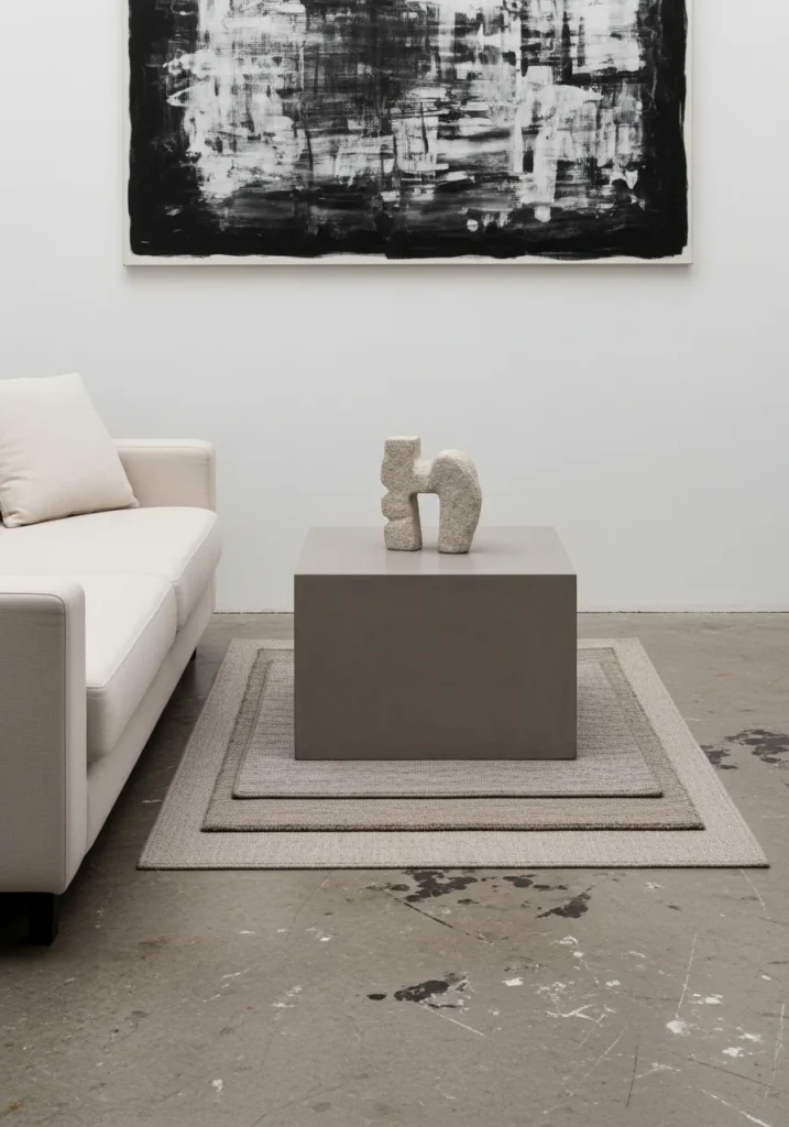 This minimalist setup highlights a solid cube-shaped table with a smooth, matte gray finish that provides a cool, architectural feel. Its chunky silhouette creates a bold statement against the creamy fabric of the sofa and the raw concrete flooring. Centered on a unique set of nested rectangular rugs, the table serves as a pedestal for a single abstract stone sculpture, keeping the entire look clean and gallery-inspired. The lack of legs or intricate details makes it an excellent choice for a modern home where you want the furniture to feel like a permanent part of the room’s structure.