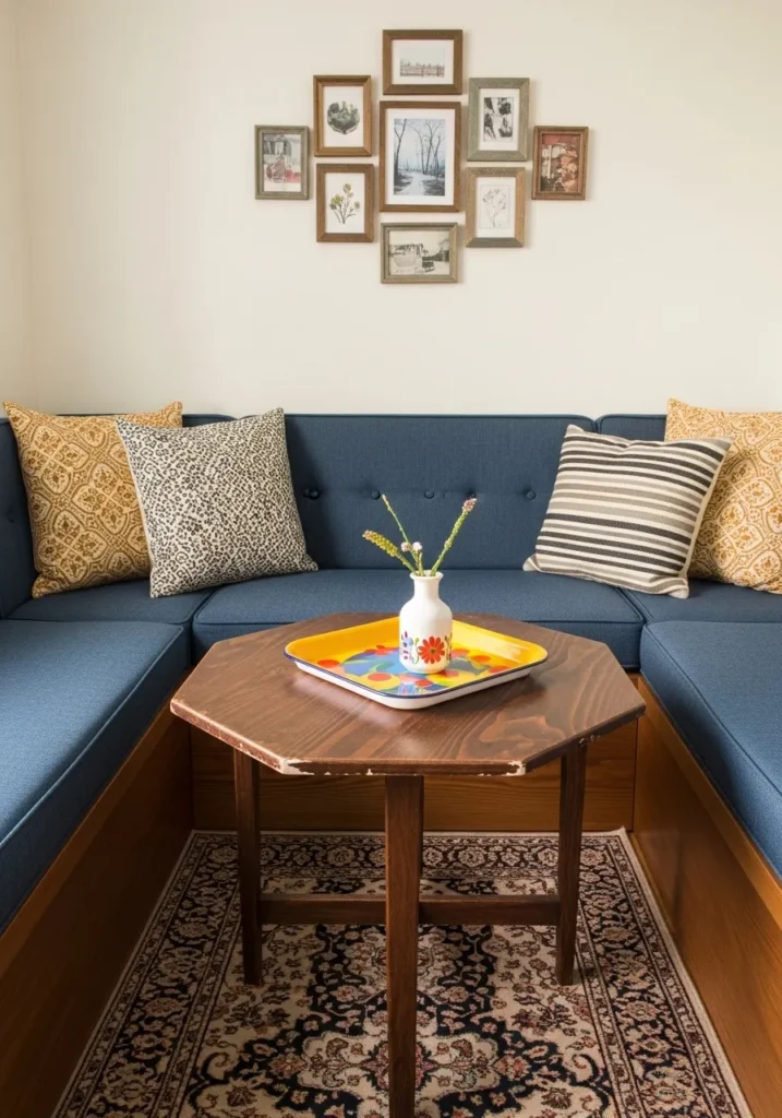 I’m totally enamored with how this shape fits so snugly into a built-in seating arrangement. It feels like a find from a hidden antique shop that was just meant to be in this specific little corner. The way it creates a central gathering spot for morning coffee or late-night chats is so inviting and warm. If you are a fan of that eclectic, collected look that feels personal and soulful, this charming wooden gem is definitely your cup of tea.