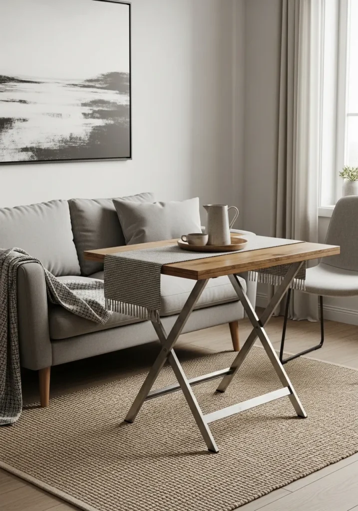 This clever design uses a collapsible X-frame base made of sturdy brushed metal, topped with a warm, natural wood surface. It is styled with a striped fabric runner and a simple ceramic pitcher set, which gives the whole room a very intentional and polished look. Positioned right in front of a soft gray loveseat, it provides a generous amount of space for a morning breakfast or an afternoon tea. The best part is that once you are done using it, the entire piece can fold flat and be tucked away in a closet or behind a sofa, keeping your floor plan completely open.