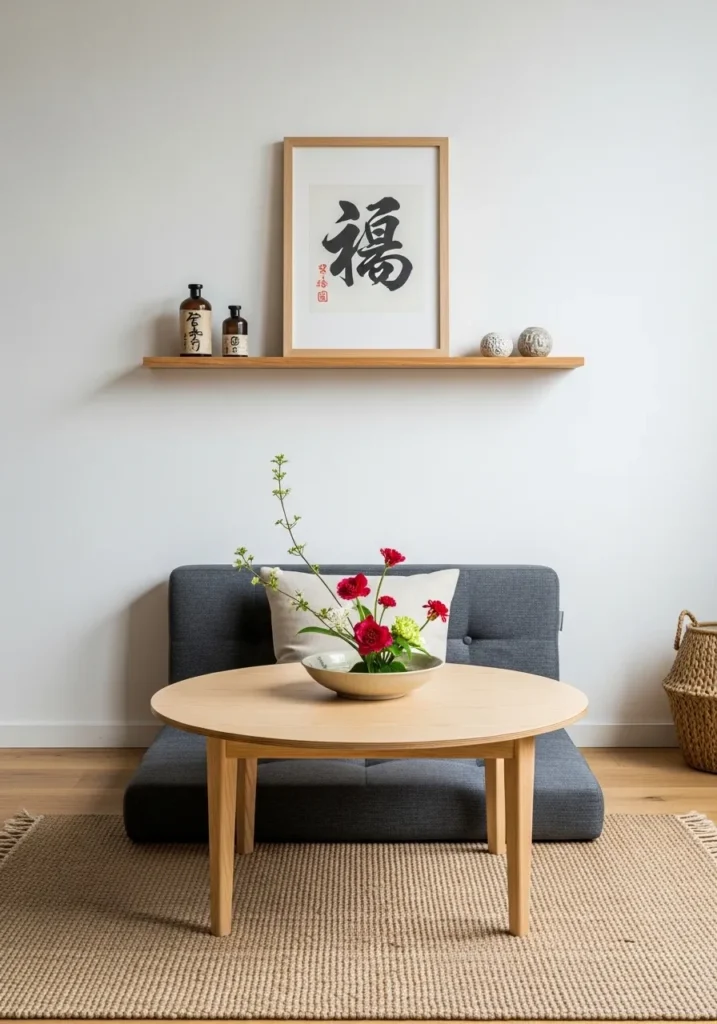 This serene arrangement features a low-profile circular table in a pale natural wood that sits perfectly atop a textured jute rug. Its short tapered legs provide just enough elevation to clear the floor while keeping the focus on a stunning floral arrangement in a shallow ceramic bowl. Positioned in front of a floor-level navy cushion, the piece creates a grounded and meditative atmosphere that feels incredibly open and spacious. The minimalist aesthetic is pulled together by a floating oak shelf displaying traditional calligraphy art and vintage apothecary jars.