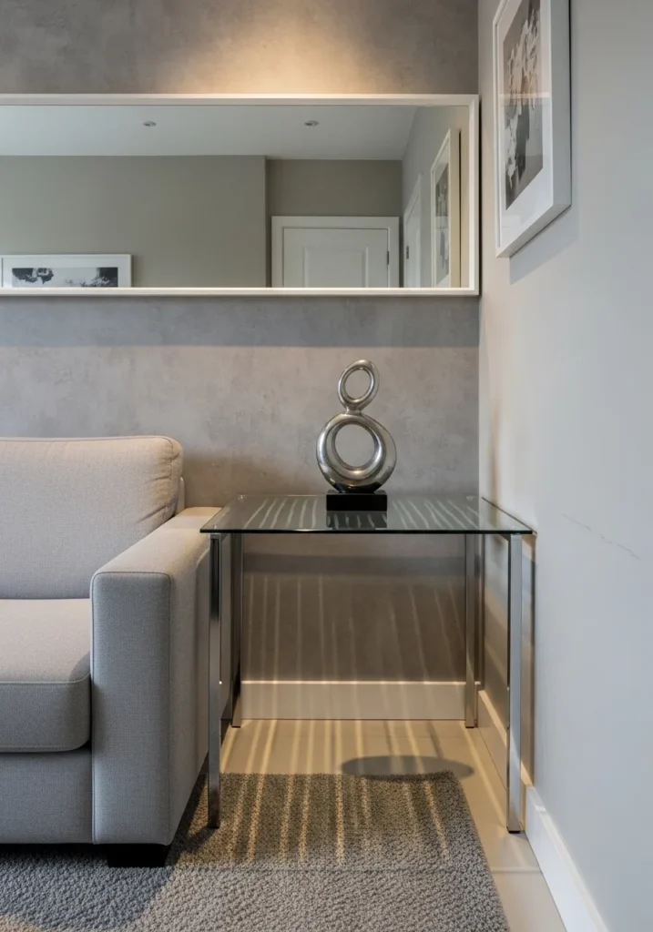 This contemporary design focuses on a transparent glass top supported by a high shine chrome frame that neatly hugs the side of a light gray sofa. Because the table is mostly see-through, it allows the beautiful texture of the gray rug and the clean lines of the wall to remain visible, which prevents the corner from feeling crowded. A striking silver infinity sculpture sits on top as a bold artistic statement that reflects the light coming from the large mirror above. Its narrow profile makes it a fantastic choice for tight walkways where you need a spot for a drink but don’t want a heavy piece of furniture blocking the path.