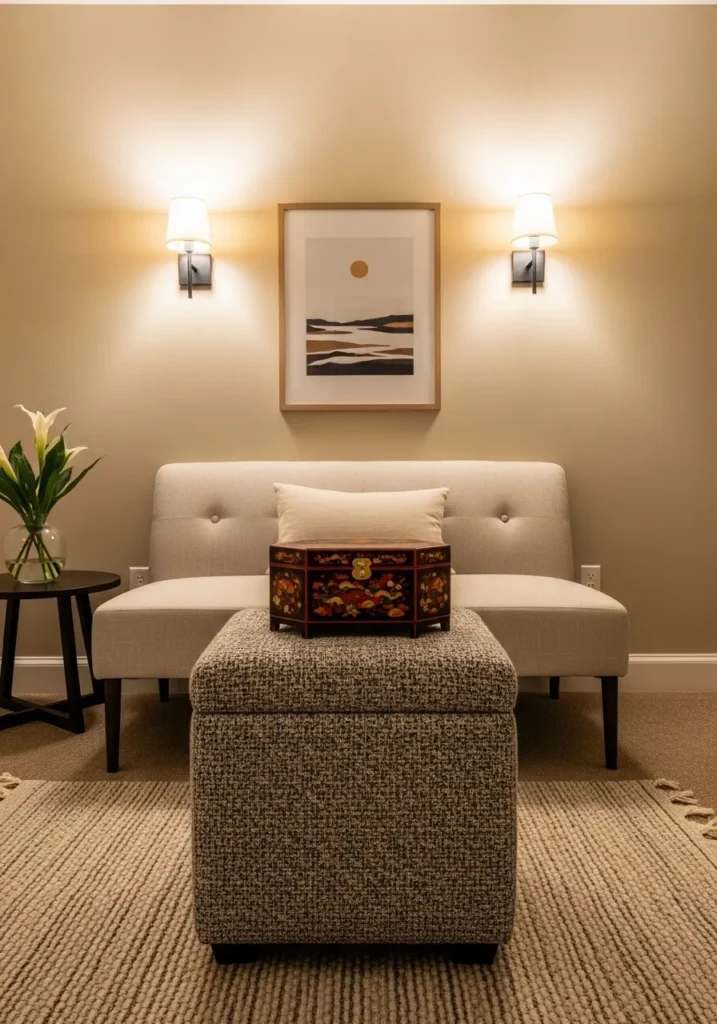 The combination of textures and lighting in this room makes it feel like a high-end boutique hotel suite. I love how the gold accents on the lacquer box catch the glow from the symmetrical wall sconces, creating such a cozy and luxurious mood. It really shows off how a few well-chosen accessories can give a tiny living room a huge personality. If you want a space that feels curated and expensive but still totally practical for daily lounging, this layered look is definitely the way to go.