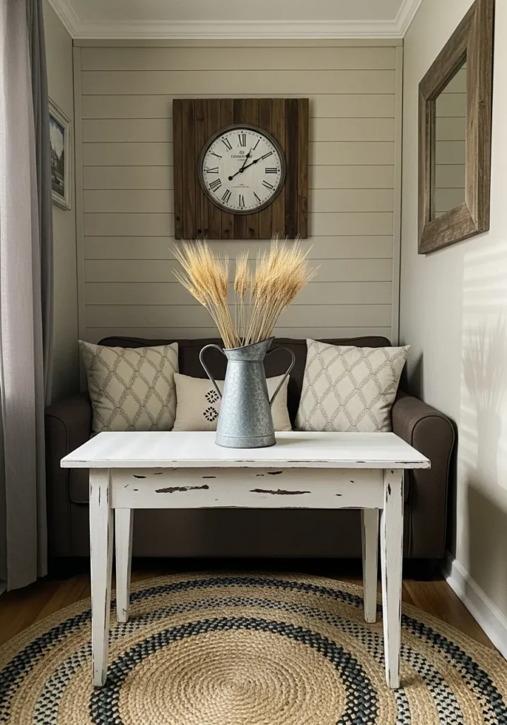 This adorable setup features a rectangular wooden table with a heavily distressed white finish that adds tons of vintage charm to the nook. The slim, tapered legs keep the piece feeling light and airy against the circular jute rug, making it a perfect fit for a small seating area. Styled with a tall galvanized metal pitcher filled with dried wheat stalks, it draws the eye upward toward the oversized wooden wall clock. The combination of the shiplap wall and the chocolate brown sofa creates a cozy, country-inspired retreat that feels incredibly welcoming.