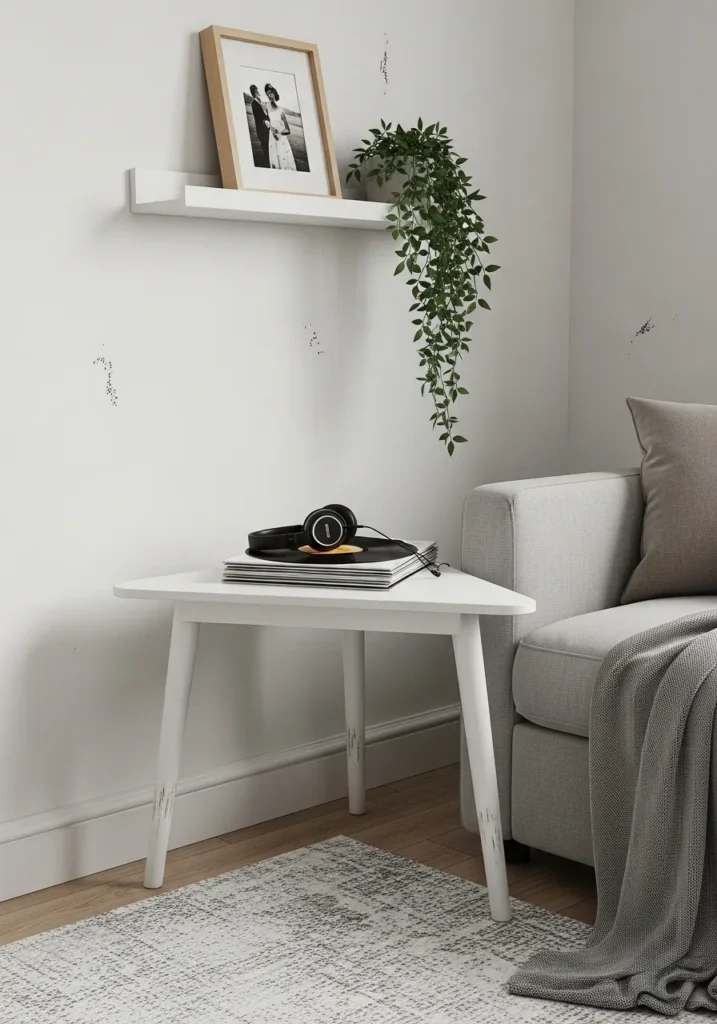 This clever three-legged design is the perfect solution for those awkward, unused corners in a small living room. Its crisp white finish and unique triangular top allow it to tuck snugly against the wall and the arm of a light gray sofa, maximizing floor space without sacrificing functionality. The table is styled with a stack of vinyl records and a pair of modern headphones, highlighting its role as a dedicated listening station or a compact hobby hub. Above it, a simple white floating shelf holds a framed photo and a cascading green plant, drawing the eye upward and making the entire corner feel intentional and curated.