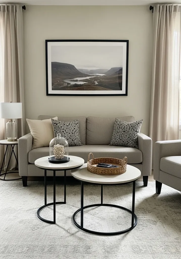 The final design in our series showcases a pair of nesting coffee tables that offer maximum versatility for a tight living room layout. These tables feature crisp white circular tops supported by slender, architectural black metal bases. The larger table holds a woven seagrass tray for remotes, while the smaller, taller table displays a decorative coral specimen under a glass cloche. This tiered arrangement adds visual interest and layers to the seating area, perfectly complementing the beige loveseat and the expansive landscape photography on the wall.