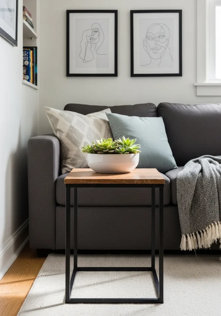 This sleek piece offers a fantastic blend of rustic wood and matte black metal that instantly anchors the room. The square top provides a sturdy surface for a lush bowl of succulents while the open frame design keeps the visual weight light so it doesn’t overwhelm the dark gray sofa. Positioned right at the end of the seating area it serves as both a handy side surface and a focal point that ties in perfectly with the modern line art on the wall. Its compact footprint is a total win for anyone trying to maximize a narrow walkway without losing out on essential tabletop space.