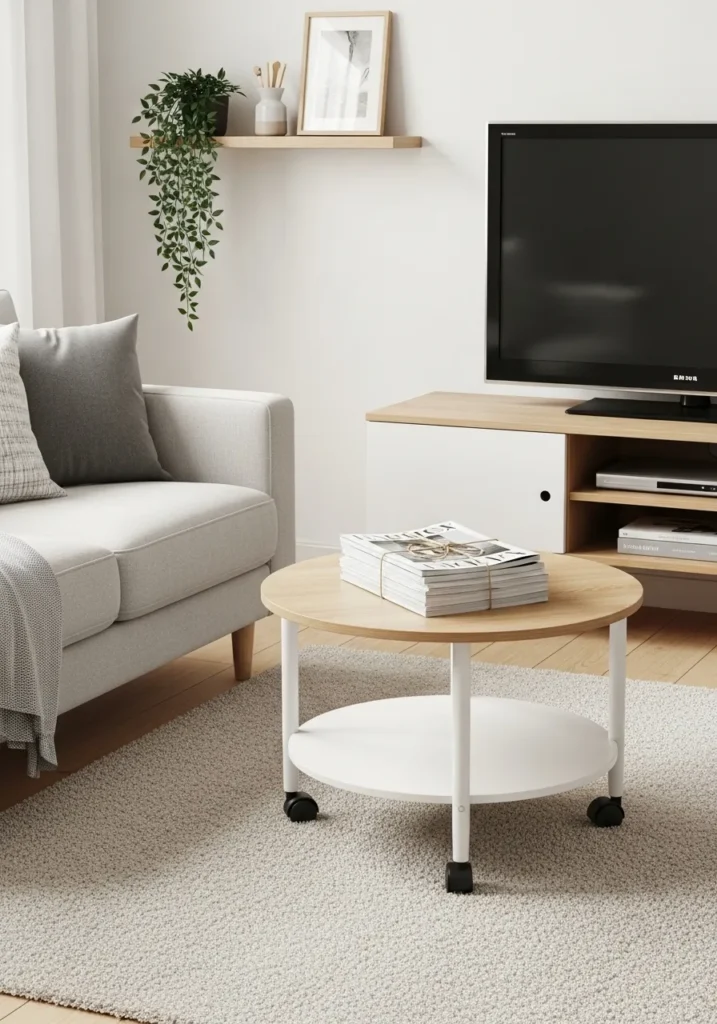 This practical piece brings so much flexibility to a smaller living room thanks to its functional wheels and double-layered storage. The light wood top paired with a crisp white lower shelf creates a bright, airy look that blends effortlessly with the light gray sofa and neutral rug. It provides plenty of room for a stack of magazines on top while keeping the bottom area open for extra essentials or decor. Because it sits on casters, you can easily slide it out of the way when you need more floor space for a workout or a movie night spread.