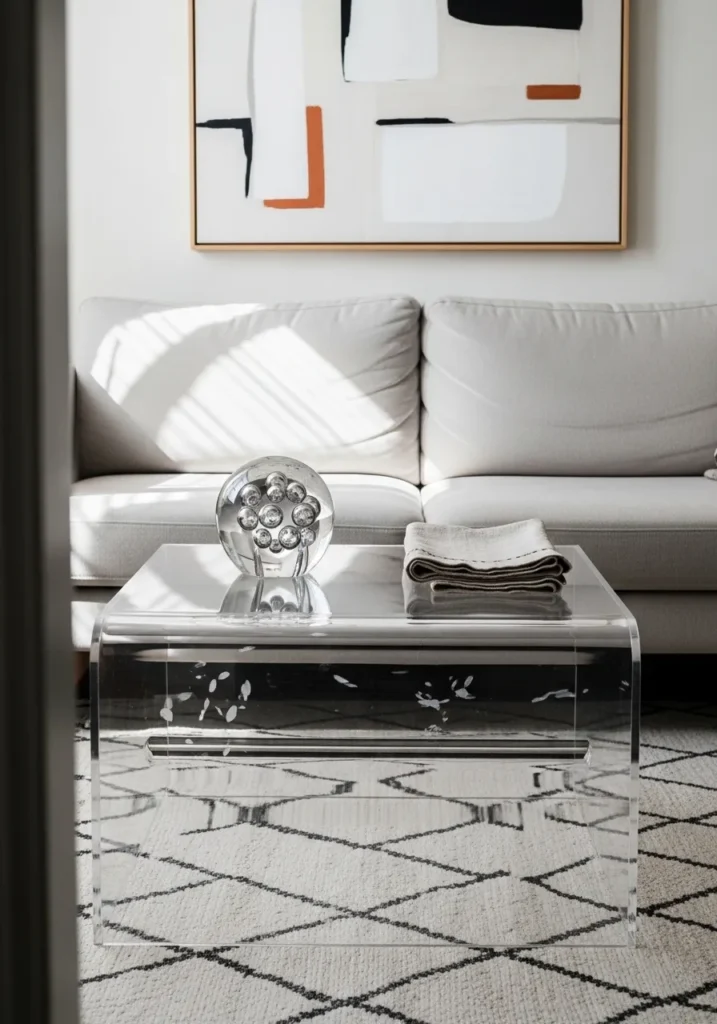 This stunning see-through piece is a total magic trick for any cramped living room. Because it is completely transparent, it virtually disappears against the patterned rug and cream-colored sofa, which allows the space to feel much larger than it actually is. The sleek, curved edges give it a soft, modern silhouette, while the flat top serves as a perfect stage for a unique crystal orb or a neatly folded throw. It provides all the surface area you need for snacks and drinks without adding a single ounce of visual clutter to your tiny home.