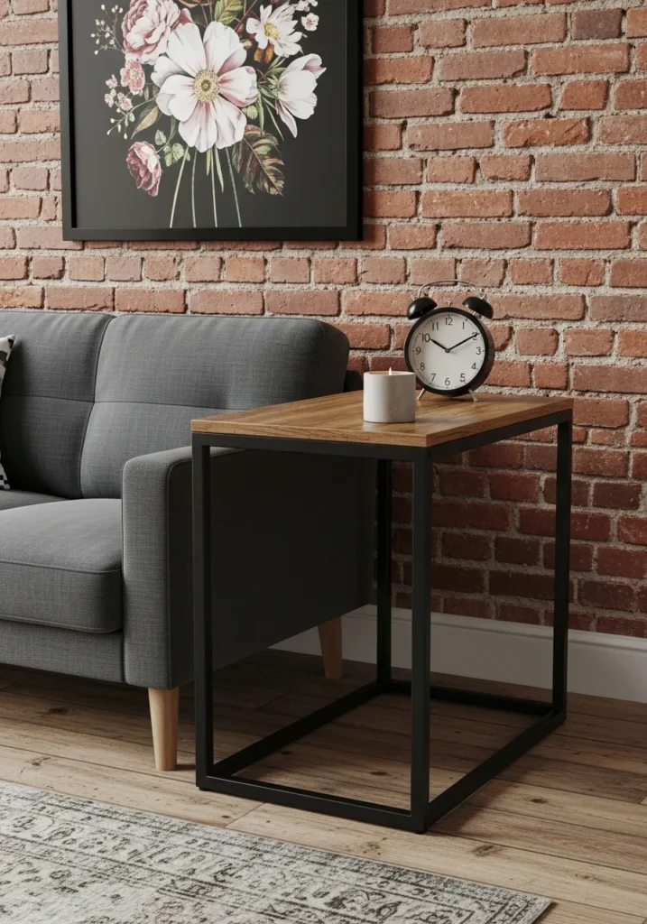 This slender piece is the ultimate space-saving hero for those of us dealing with a tight floor plan. It boasts a beautiful walnut-toned wooden surface supported by a rigid black iron frame that feels both sturdy and incredibly lightweight. The open C-shaped structure allows the base to slide right under the sofa edge, which brings your coffee or laptop within easy reach without taking up extra rug space. Set against a textured red brick wall and paired with a classic alarm clock and candle, it adds a touch of raw, loft-style character to a cozy seating area.