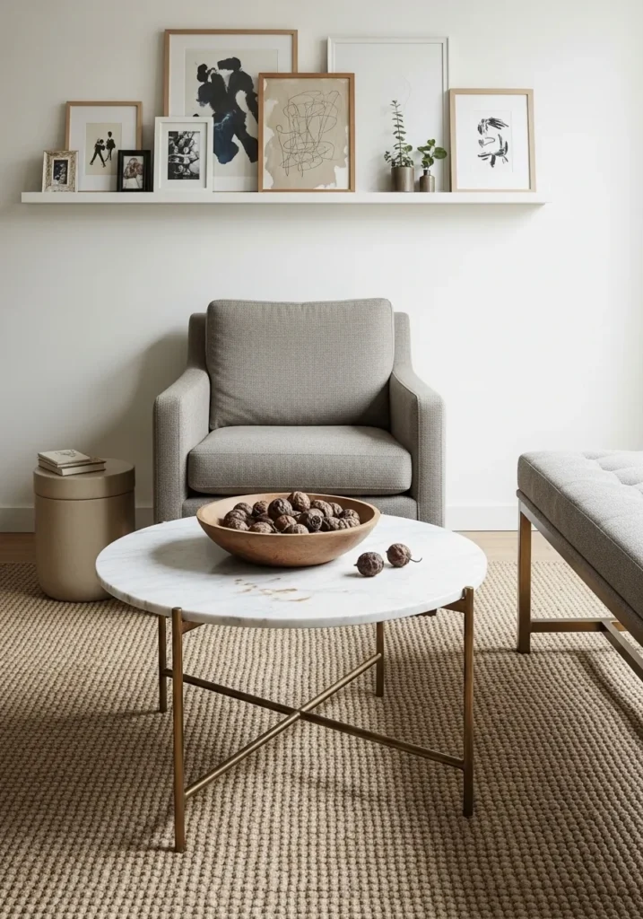 This elegant design showcases a stunning white marble surface supported by a slender cross-legged brass frame. The circular top provides a generous area for a decorative wooden bowl filled with dried botanicals, while the open base maintains a light and airy feel across the textured jute rug. Tucked beside a plush gray armchair and a matching ottoman, this piece serves as a sophisticated anchor for the room without blocking the flow of movement. Its mixture of organic stone and metallic accents coordinates perfectly with the gallery shelf of framed art in the background.