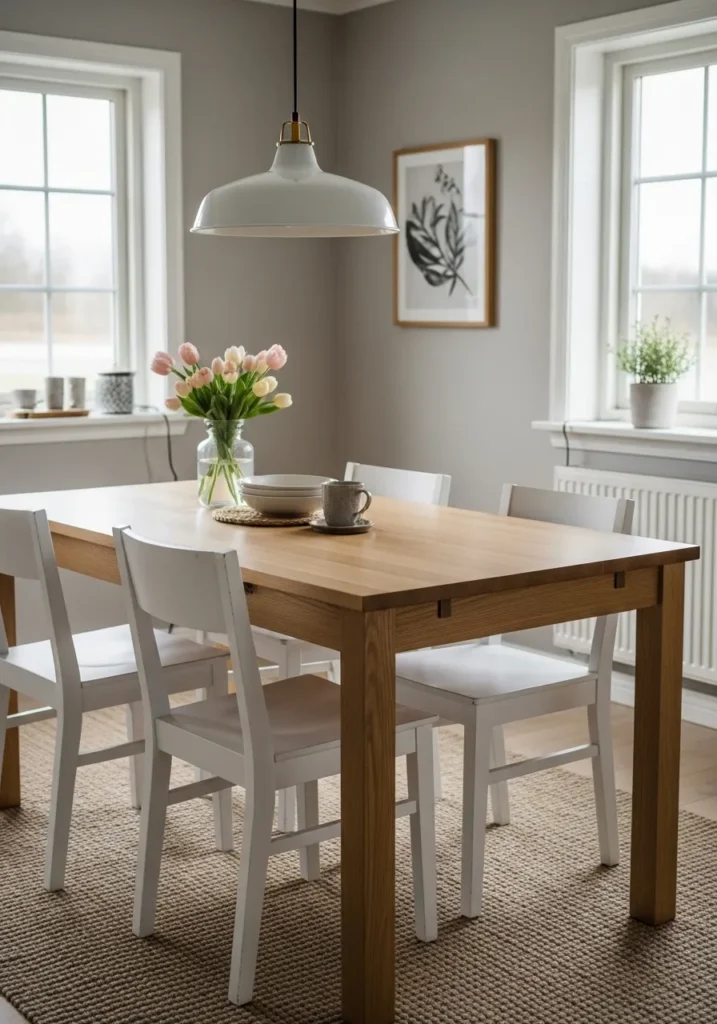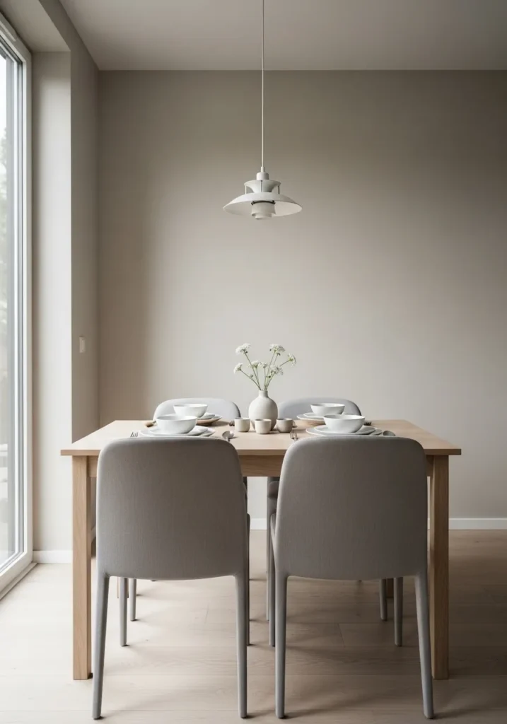 This setup keeps things minimal with a light wood table and soft upholstered chairs. The muted color palette and simple pendant light create a peaceful atmosphere. It feels uncluttered but not cold which is ideal for daily use.