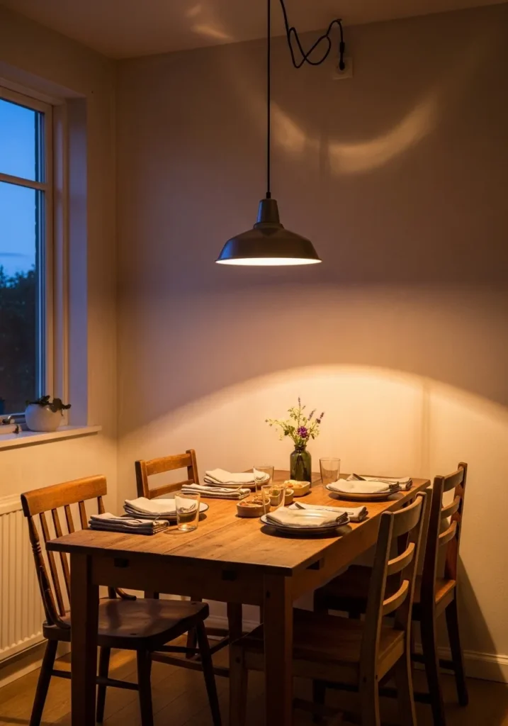 This dining area shines in the evening with warm light from a simple pendant lamp. The wooden table and chairs feel classic while the low light creates a cozy atmosphere. It feels perfect for quiet dinners and relaxed conversations.
