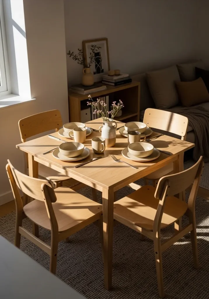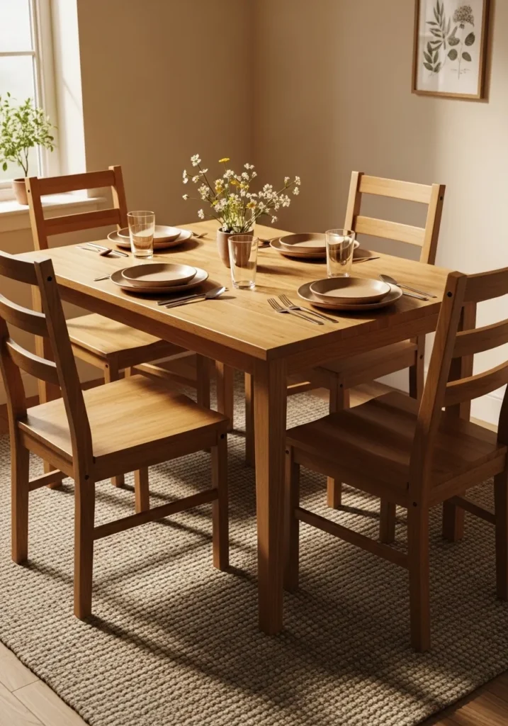This setup features a straightforward wooden table paired with matching chairs and a neutral rug underneath. The light walls and natural materials keep the room feeling open and easy. It is simple but thoughtfully put together.