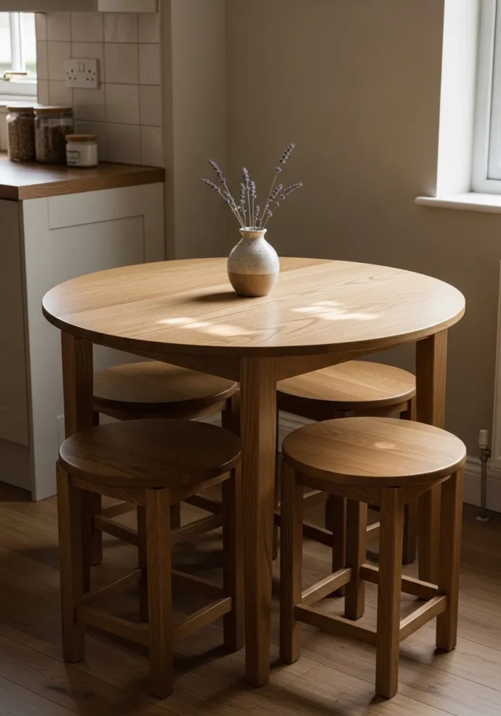This compact round table fits neatly into a smaller area with stools tucked underneath. The light wood finish keeps it from feeling heavy and the minimal decor lets the shape stand out. It is practical without sacrificing style.