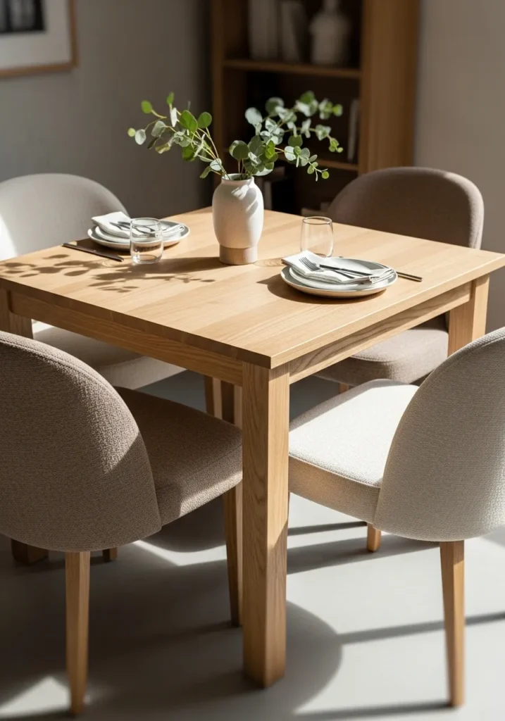 This table is all about warmth with rich wood tones and sunlight spilling across the surface. The matching wooden chairs create a cohesive look while the casual table setting makes it feel ready for real life. It feels like a space meant for long dinners and slow conversations.