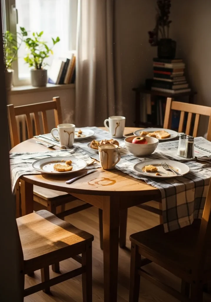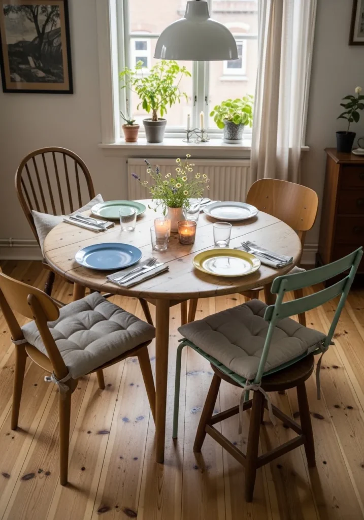 This small dining area feels extra warm thanks to the tablecloth and soft natural light coming through the window. The wooden table and chairs keep it grounded while the layered textures add that cozy lived in feeling. It looks perfect for slow mornings and relaxed meals.