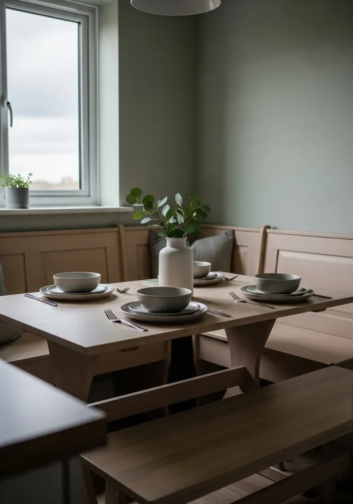 This dining nook uses a built in bench to create a snug and efficient setup. The wooden table pairs beautifully with the soft wall color and neutral seating. It feels intentional and space smart without feeling tight.