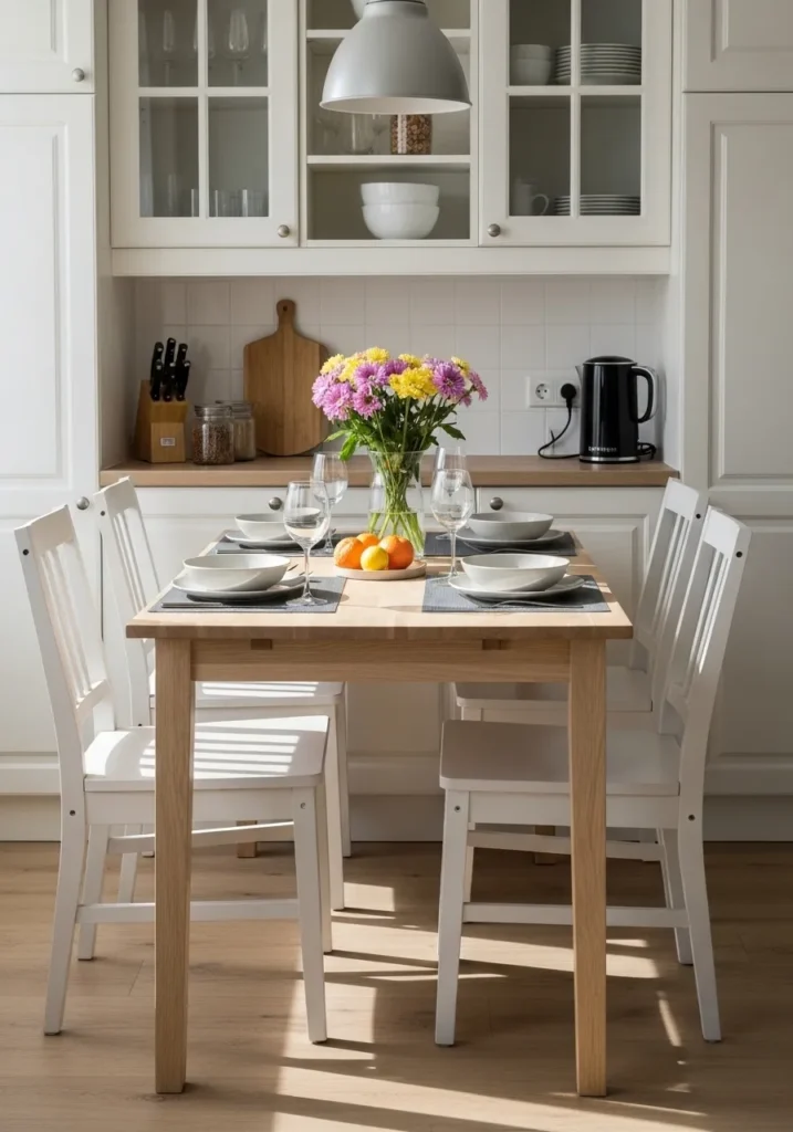 This dining area blends a light wood table with white cabinetry and fresh flowers on the table. The clean backdrop keeps the room bright while the natural wood adds warmth. It feels fresh and timeless at the same time.