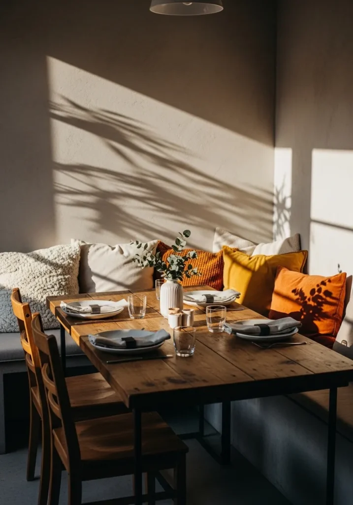 This dining nook feels tucked in and intimate with a wooden table pushed close to the wall and soft cushions adding comfort. The mix of textures from the wood table to the fabric seating gives the space depth without feeling busy. It is small but full of personality.