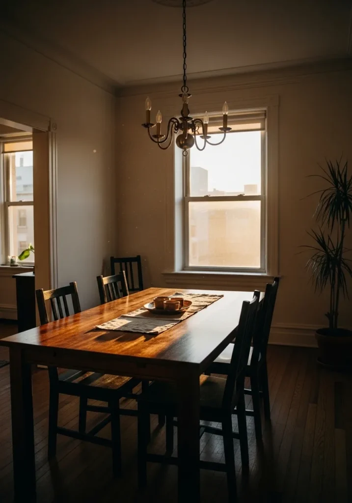 This space uses darker tones and classic furniture to create a slightly moodier vibe. The wooden table and chairs feel timeless while the chandelier adds a touch of elegance. Natural light from the windows keeps it from feeling too heavy.