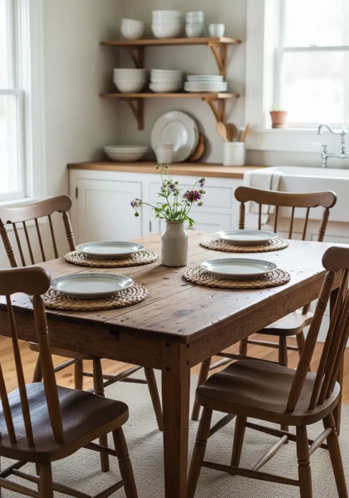 This dining area blends cottage charm with everyday practicality. The wooden table is simple and sturdy while the open shelves in the background add a homey feel. Neutral colors keep the space calm and inviting.