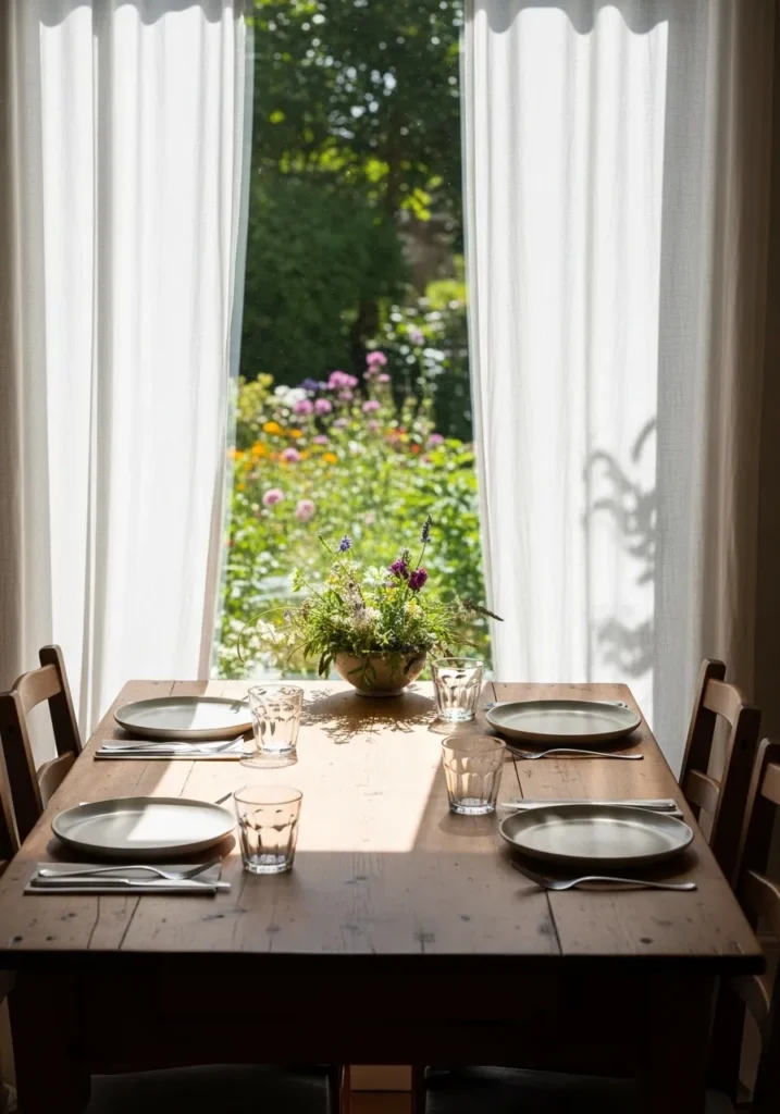 This dining setup sits right by large windows with sheer curtains that let the daylight gently pour in. The wooden table feels solid and grounded while the simple table setting keeps everything relaxed and unfussy. The greenery outside almost becomes part of the decor which makes the whole space feel fresh and calm.