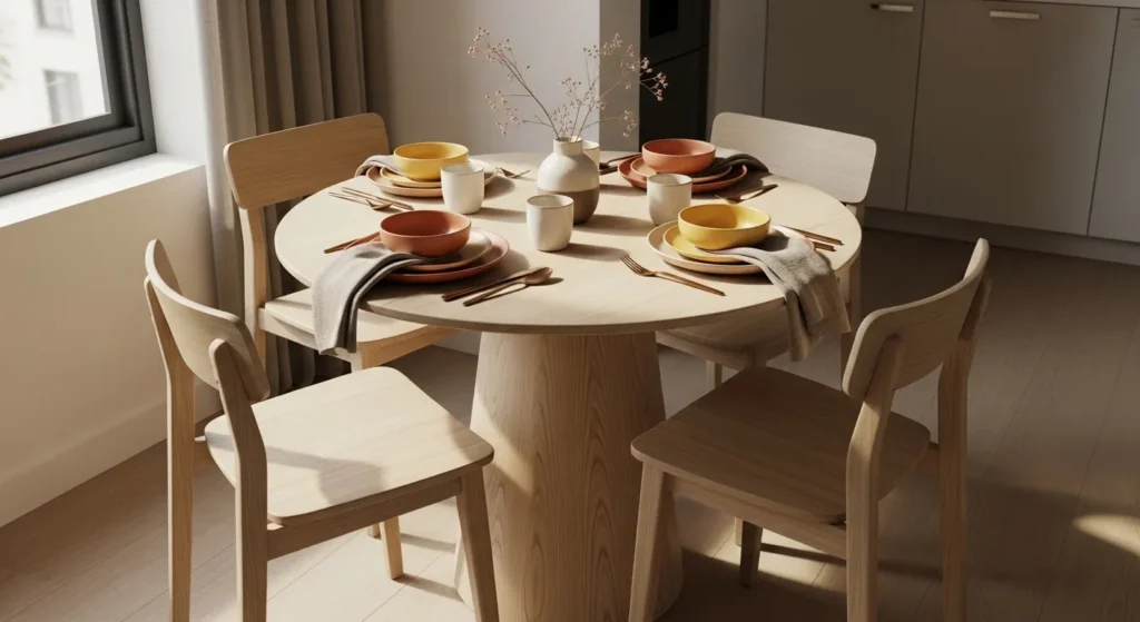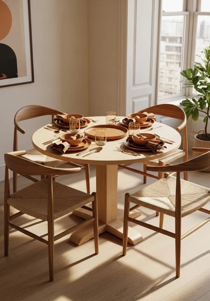 A round wooden table takes center stage here paired with curved chairs that feel light and welcoming. The soft tones and natural materials make the space feel airy while still being warm. It is a great example of how a round table can soften a room and make conversation feel effortless.
