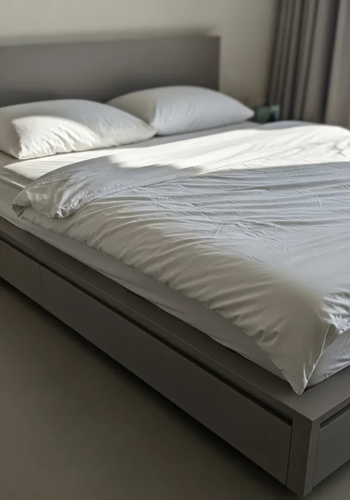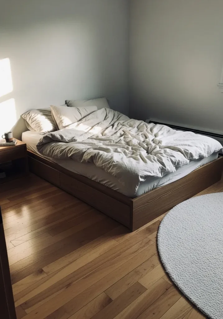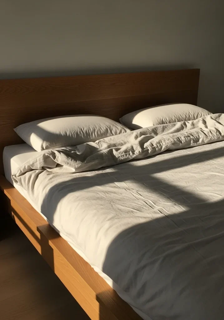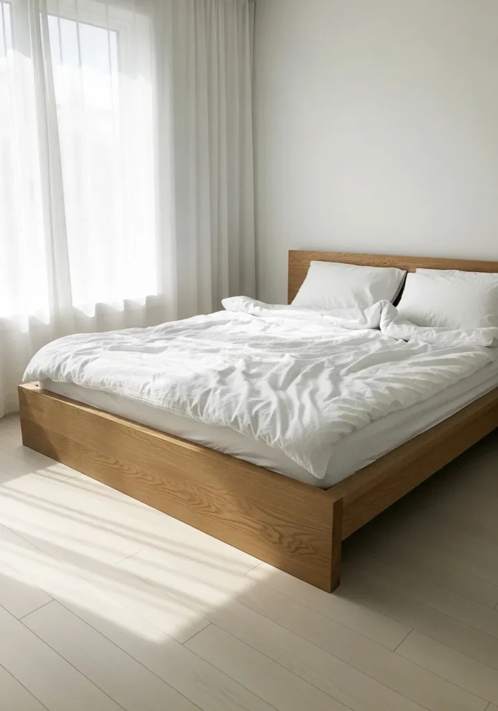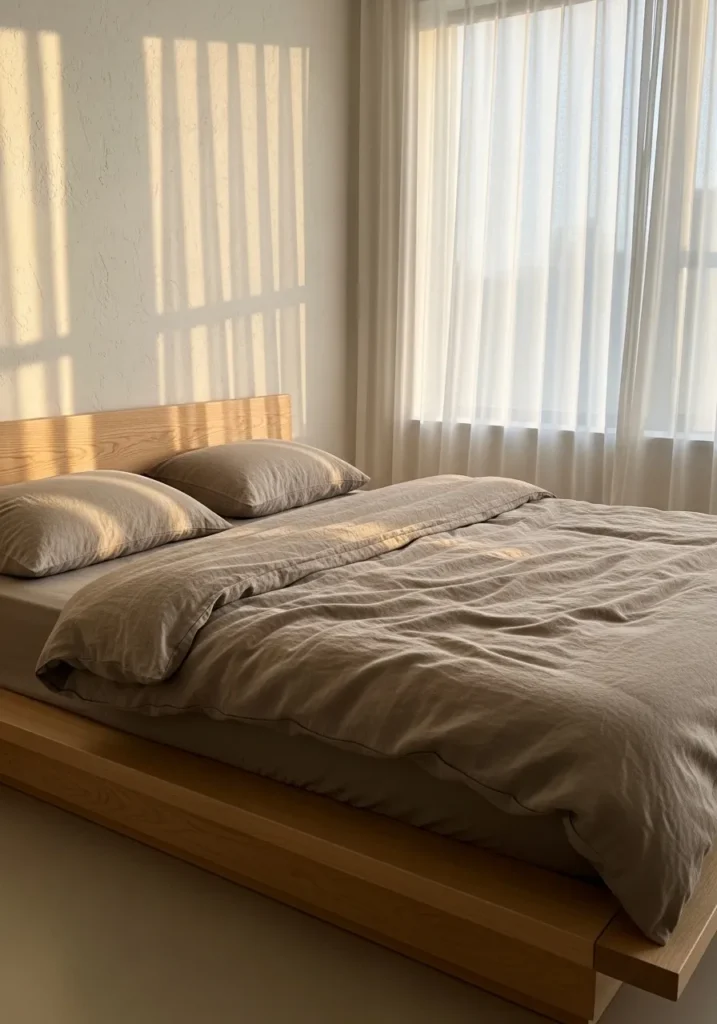 This platform bed features a warm wood frame with a smooth wide headboard that grounds the room without making it feel heavy. Light neutral bedding is loosely arranged and catches the sunlight in the most natural way. The low profile keeps the space open while the soft shadows add depth and calm. Everything feels simple quiet and perfectly balanced.