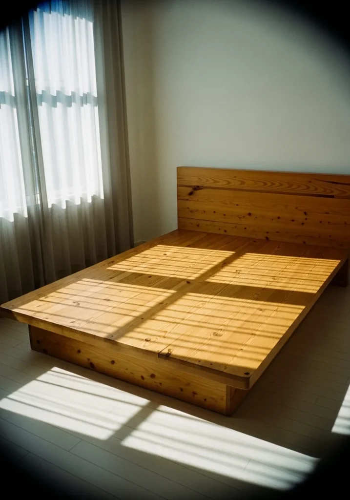 This bedroom features a low pine platform bed with a wide solid frame and a simple headboard that lets the wood take the spotlight. Sunlight streams through sheer curtains and lands softly across the surface of the bed creating warm natural patterns. The room stays minimal with light walls and open floor space which keeps everything feeling calm and breathable. The raw wood texture adds warmth without making the space feel heavy.