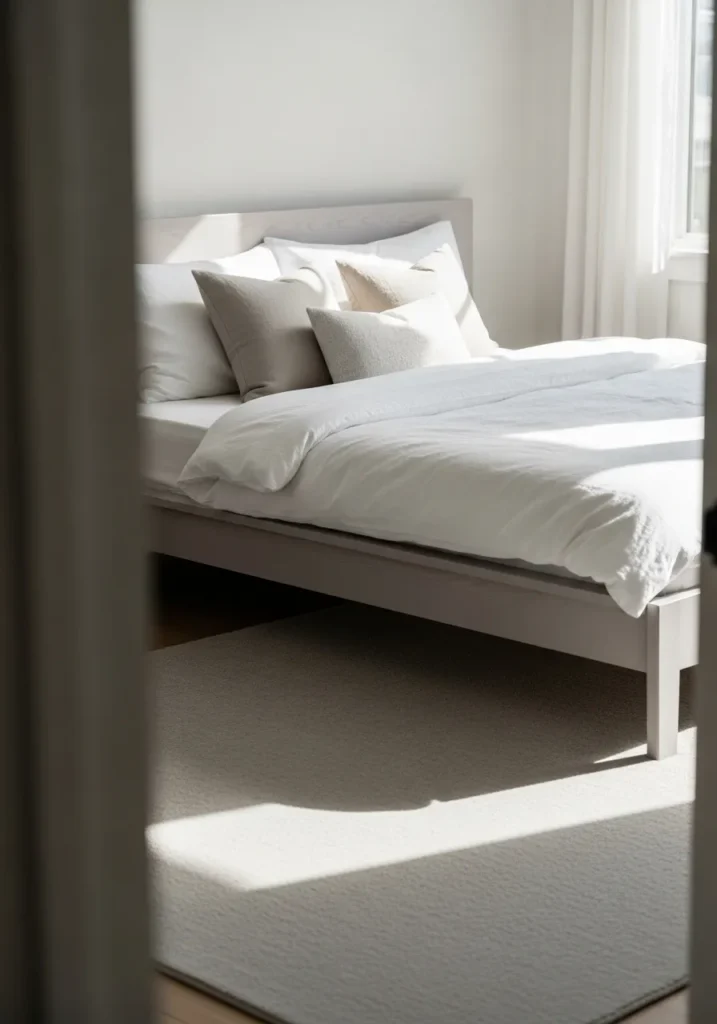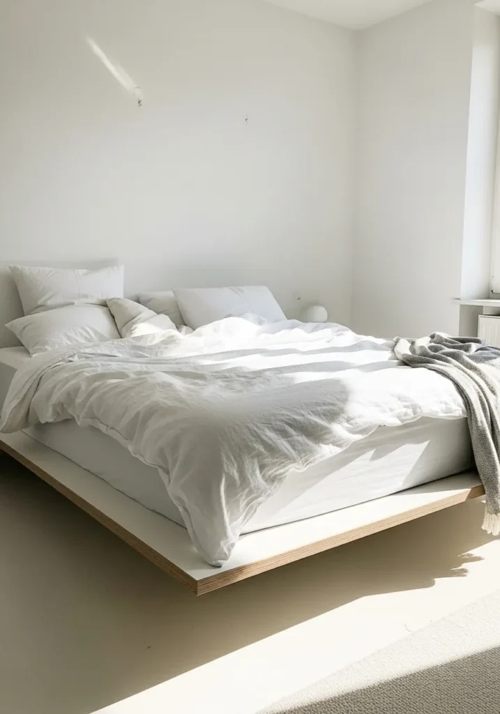 This bedroom features a white platform bed with a slim floating design that makes the whole space feel airy and open. Soft white bedding is loosely layered and paired with a subtle wood edge that adds warmth without breaking the calm. Sunlight pours in and washes across the bed and floor which keeps everything feeling bright and peaceful. The room stays intentionally simple so the light and textures can really shine.