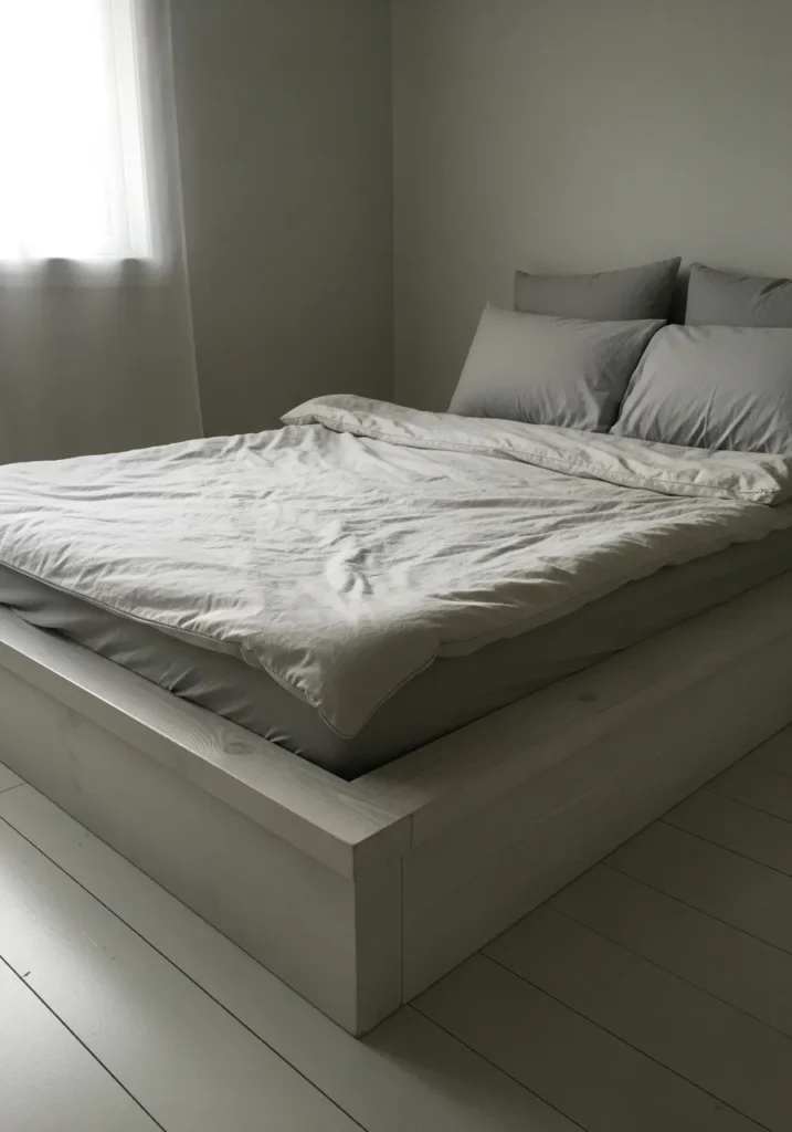 This bedroom features a whitewashed platform bed with a solid low frame that feels sturdy yet visually light. Soft gray and white bedding is gently layered and slightly rumpled which adds an easy lived in feel. Pale walls and light floors keep the space bright while natural light filters in and softens every surface. The overall look is calm minimal and quietly comfortable.