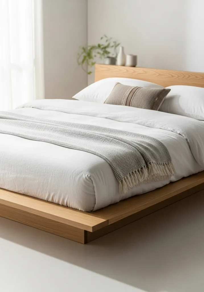 This bedroom centers around a light oak platform bed with a slim floating edge that keeps the whole space feeling open and calm. Crisp white bedding is paired with a soft textured throw and a single accent pillow in warm neutral tones. Gentle daylight filters in and highlights the natural grain of the wood without overpowering the room. Everything feels balanced simple and thoughtfully styled without excess.