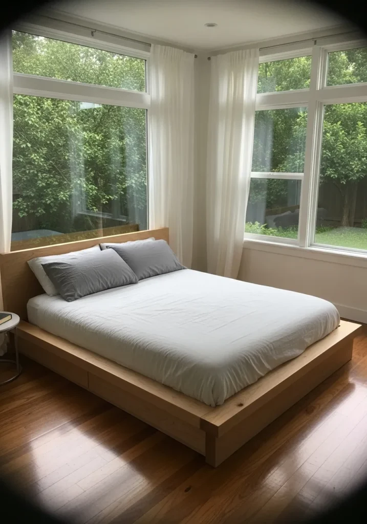 This bedroom features a low wood platform bed positioned perfectly between wide corner windows that flood the space with natural light. The simple wood frame feels solid but stays visually light thanks to its clean edges and low height. Crisp white bedding keeps everything fresh while soft gray pillows add a gentle contrast. Sheer curtains frame the greenery outside and give the room a calm airy feeling.