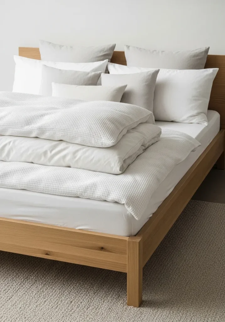 This platform bed features a warm wood frame with slim legs that lift the design just enough to keep the room feeling open. Soft white bedding is layered generously with textured duvets and a mix of neutral pillows that add depth without visual heaviness. The clean wall backdrop and simple rug keep everything calm and balanced. The overall look feels polished but still relaxed and very inviting.