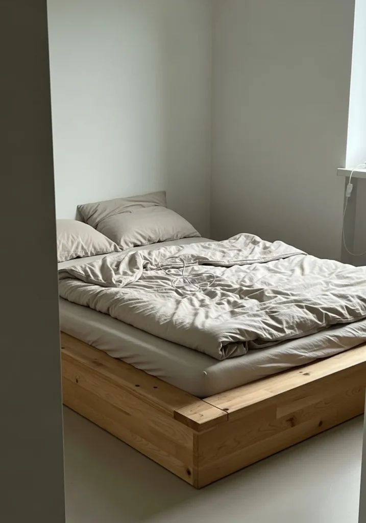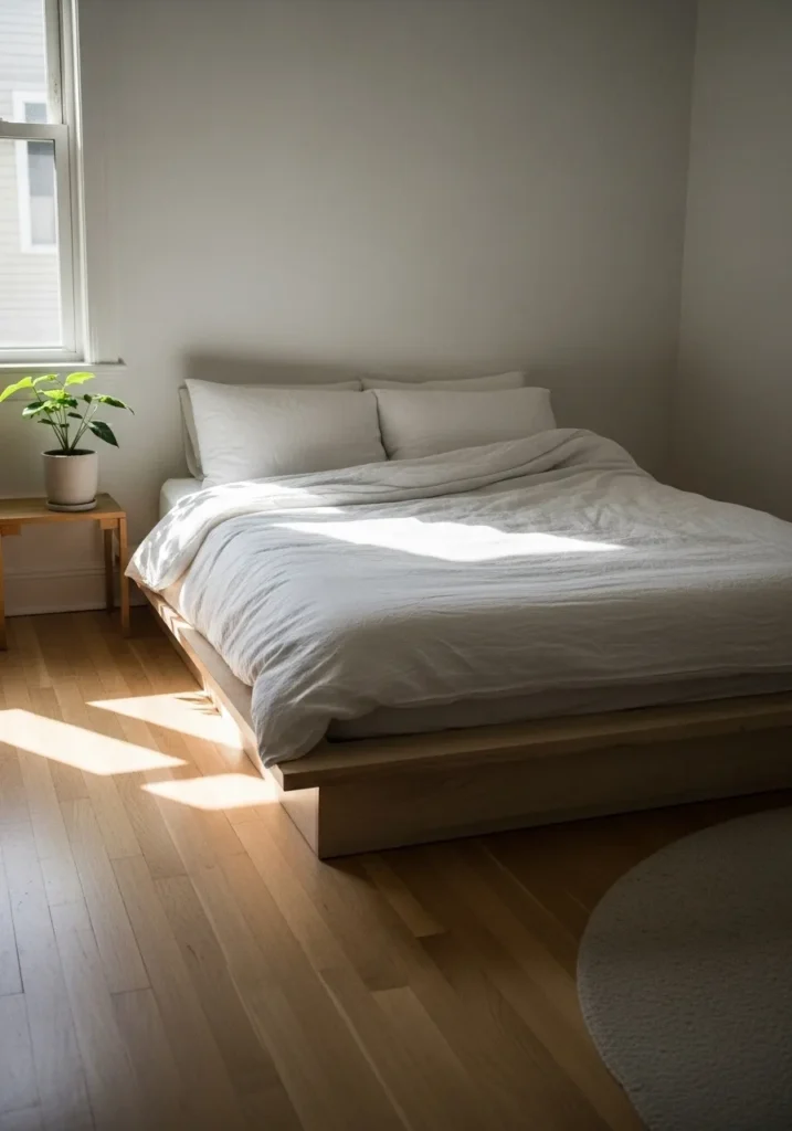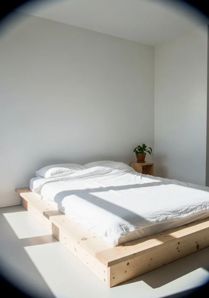 This bedroom centers around a low pale wood platform bed that feels grounded and airy at the same time. Crisp white bedding keeps things simple while sunlight stretches across the mattress and floor creating gentle shadows. The room is intentionally sparse with clean walls and a tiny wood side table holding a single plant. Everything about this setup feels open calm and quietly intentional.