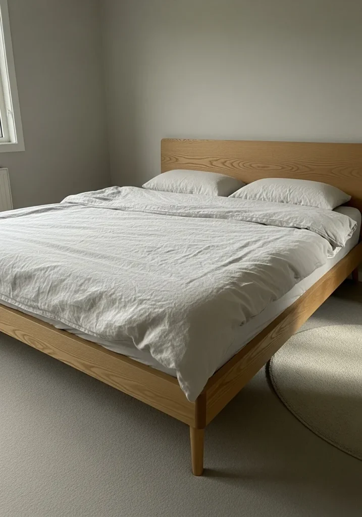 This bedroom features a light oak platform bed with gently rounded legs and a smooth headboard that keeps the design feeling soft and approachable. Crisp white bedding adds a fresh look while the low profile and open space underneath help the room feel airy. Neutral walls and a simple rug keep the focus on the natural wood and calm textures. Everything feels balanced and quietly refined.