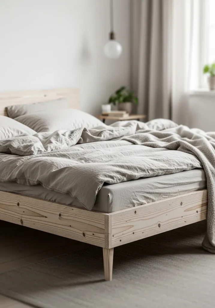 This bedroom centers around a simple light wood platform bed with visible grain that feels honest and relaxed. Soft gray and off white linen bedding is loosely layered which gives the space an easy lived in look. Slim legs lift the bed just enough to keep the room feeling open while neutral walls curtains and a quiet rug keep everything calm and breathable. The whole setup feels warm without being heavy and minimal without feeling cold.