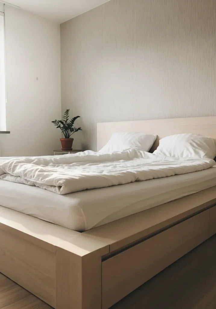 This bedroom features a light wood platform bed with built in storage that stays sleek and visually simple. The low profile frame keeps the room feeling open while crisp white bedding adds a fresh airy look. Soft textured walls and minimal decor let the bed blend naturally into the space instead of dominating it. A small plant adds a touch of life without breaking the calm neutral palette.