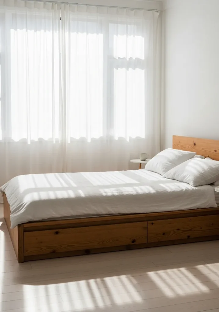 This bedroom features a low wood platform bed with integrated drawers that keep everything tidy without adding visual weight. The warm natural wood pairs beautifully with crisp white bedding and sheer curtains that let sunlight spill softly across the room. Clean lines and a simple layout help the space feel open and calm. Every element feels practical yet gentle which keeps the overall look light and breathable.