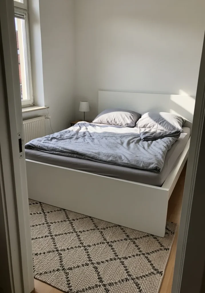 This small bedroom keeps things fresh with a white platform bed that blends right into the walls and lets the light do all the work. The low frame feels solid but never bulky which is perfect for a compact space. Soft gray bedding adds just enough contrast while a simple rug warms up the floor. Sunlight pours in from the window and gives the room that quiet lived in apartment feel.