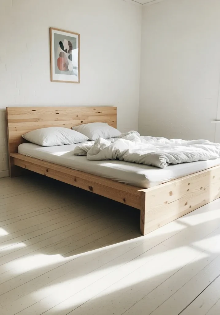 This bedroom features a sturdy pine platform bed with visible knots and a wide frame that feels natural and unfussy. Crisp white bedding keeps the look light while sunlight spills across pale floors and soft walls. A small piece of wall art adds just enough personality without distracting from the calm setup. The overall feel is relaxed and real like a space meant to be lived in not styled to perfection.