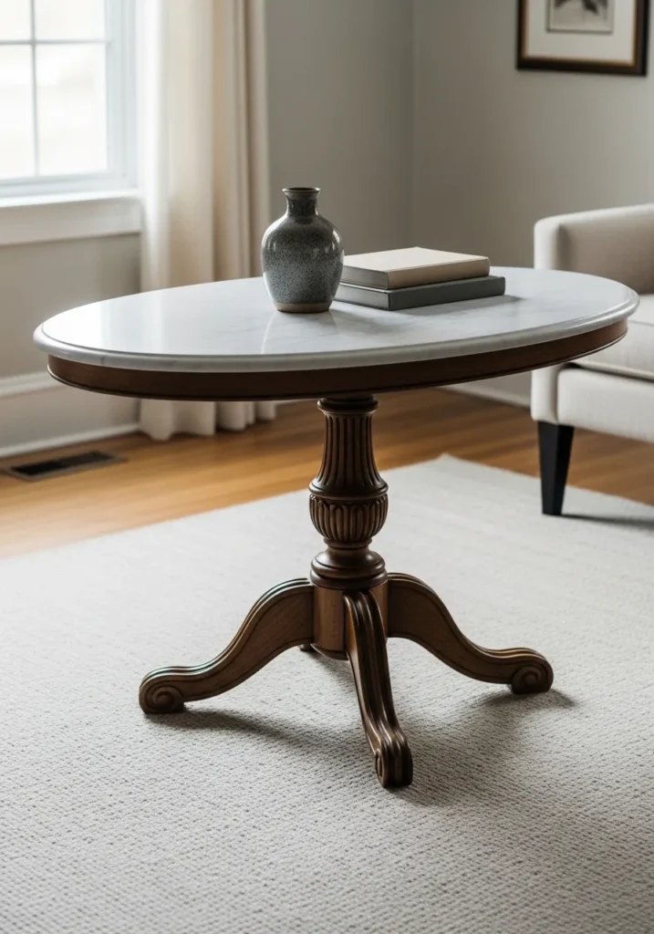 This piece brings a soft and sophisticated vibe to a living room with its smooth white marble top and richly carved wooden base. The oval shape is perfect for smaller spaces because it lacks sharp corners, which helps the room feel more open and airy. You can see the intricate detailing on the central pedestal and those curvy legs that give it a sturdy yet graceful silhouette. It sits beautifully on a neutral textured rug and pairs perfectly with understated decor like a simple ceramic vase and a few favorite books.