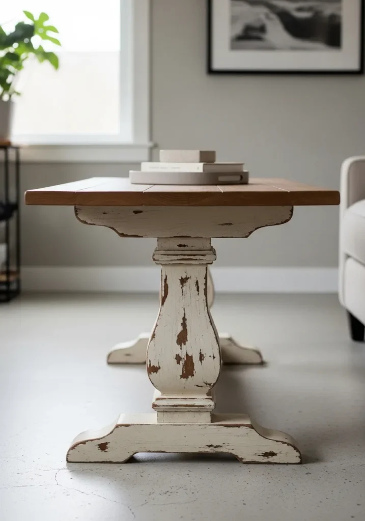 This lovely piece features a wonderful contrast between a natural wood plank top and a heavily distressed white base. The trestle-style legs provide a sturdy and architectural feel, while the chipped paint finish adds heaps of vintage character and a relaxed coastal vibe. It has a slim profile that makes it a great fit for narrower living areas without sacrificing that cozy farmhouse charm. Positioned in a sunlit room with clean grey walls and a simple tray of books, it acts as the perfect bridge between old-world textures and a fresh modern aesthetic.